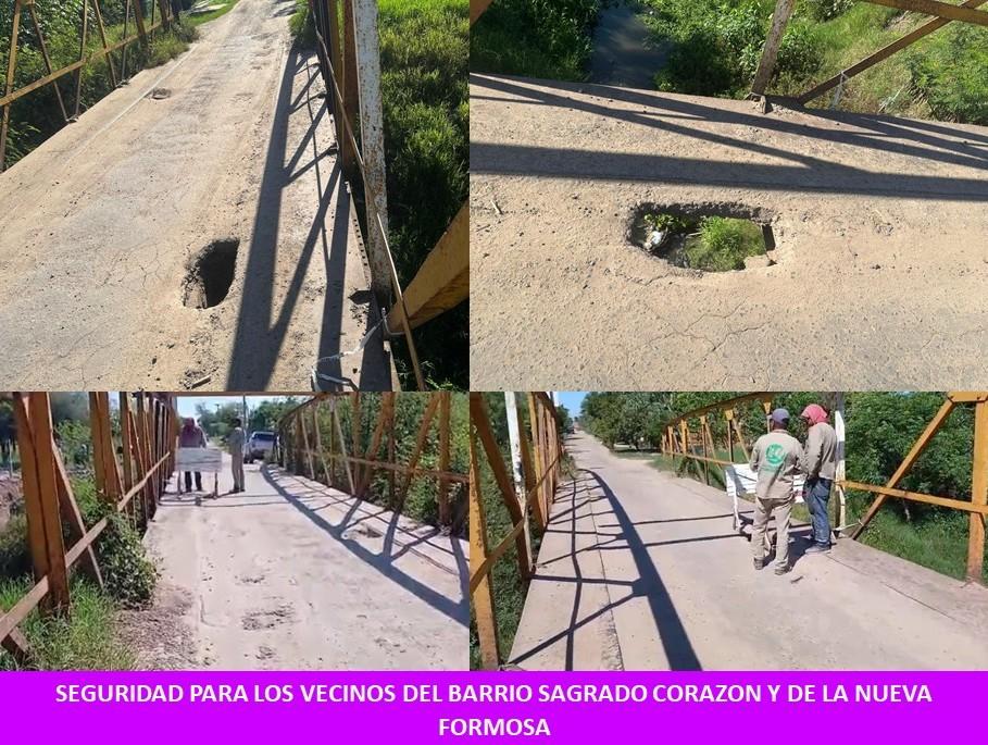 Tras la intervención de la Defensoría del Pueblo de la Provincia de Formosa, el Área de Obras Públicas de la Municipalidad de la ciudad, procedió a “balizar y señalizar” un importante hueco en el viejo puente de metal que une a los miles de vecinos que viven en las barriadas antes citadas, evitándose de esta forma, cualquier siniestro vial o altercado en vehículos, motovehículos y peatones, que diariamente lo utilizan para desplazarse de un punto a otro de la ciudad. Se acordó, concretar estudios técnicos rápidamente, a fin de brindar una solución de fondo, evitando la clausura de esta estructura, en principio, para no perjudicar a las personas que la utilizan, pues de lo contrario, deberían dar una vuelta muy extensa que, de última, si no existen alternativas, se llevará adelante para garantizar la vida y la integridad psicofísica de quienes lo utilizan.